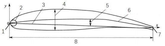 8. 以下为某翼型示意图,请标注图中 1 至 8 几何参数的名称,并简 述其定义。