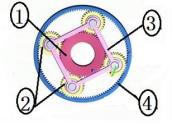 9. 兆瓦级风电机组齿轮箱多使用行星齿轮传动,请标示以下各部件 名称。假定本图为风电齿轮箱的一部分,哪一个部件是不转动的;①和③ 两个部件中哪一个部件是主动的,哪一个部件是被动的?
