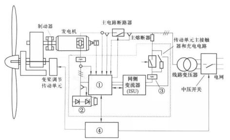 4. 下图是带低电压穿越的双馈机组框图,描述图中编号 1、2、3、4 对应的功能名称。