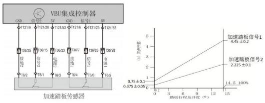 62.某品牌纯电动汽车加速踏板位置传感器的控制电路和输出特性如图所示,以下选项中据图所作的分析,错误的是()。