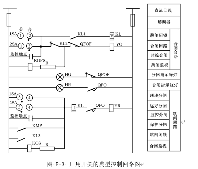 Je3F5065如图F-3所示,说明厂用高压开关的操作过程,要求说明合闸、分闸和“防跳”过程。(图中:YO是开关的合闸线圈,YR是开关的分闸线圈,KL是开关的防跳跃闭锁继电器,KOFS是跳闸位置继电器,KOS是合闸位置继电器,KMP是保护跳闸接点,SA是开关的分、合闸操作把手,QFO是开关的动合辅助接点,QFOF是开关的动断辅助接点。)
