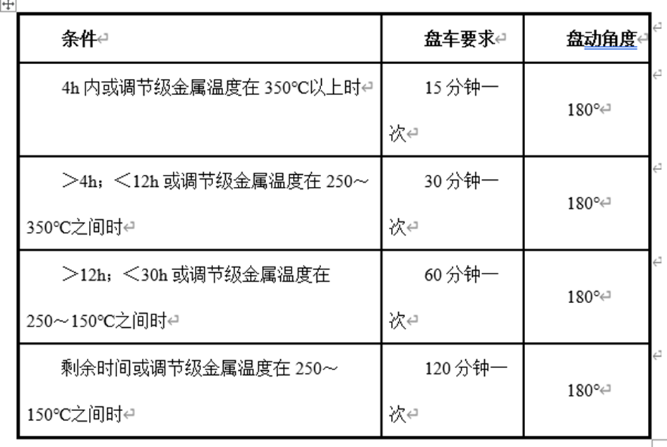 5.当电动盘车盘不动时、盘车电流较正常值大、摆动或有异音时,应查明原因及时处理,再次电动盘车前必须手动盘车两周,确认未有卡涩情况时,方可电动启动盘车装置运行,严禁用行车强行盘车。6.盘车装置暂不能连续运行时,可每15分钟手动盘车180°。7.当汽封摩擦严重时,将转子高点至于最高位置,关闭汽缸疏水,保持上、下缸温差。监视转子弯曲度,当确认转子弯曲度正常后,再手动盘车180°。8.盘车停止后检查汽缸温度80℃以下,方可停止高压交流油泵运行。