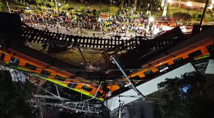 1、2021年5月3日,墨西哥首都墨西哥城奥利沃斯郊区一段高架桥梁坍塌,导致一列地铁列车脱轨(如下图所示),造成至少25人死亡、70多人受伤。