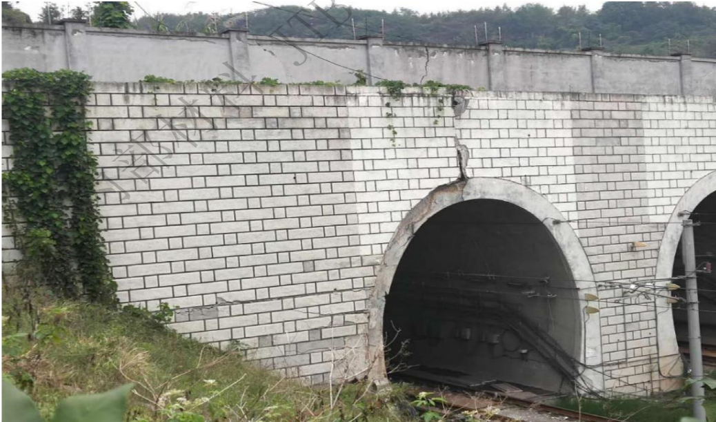 1、2018年10月11日,某市城市轨道交通运营单位发现某隧道保护区内有大量施工弃土,隧道洞口上方部分围墙坍塌,洞门上方结构开裂错位(如下图所示),隧道内上下行出现裂纹,轨行区外的道路地面出现位移和裂痕等情况。事件主要原因为施工单位在修建施工便道过程中擅自向地铁保护区内倾倒大量施工弃土。