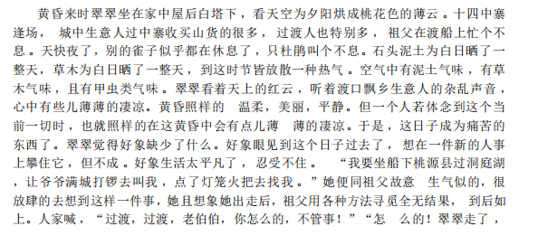 ②翠翠和祖父原本约好祖父守船,翠翠同黄狗过顺顺吊脚楼去看热闹。翠翠从不答应到答应,后又翻悔,以为要看两人去看,要守船两人守船。