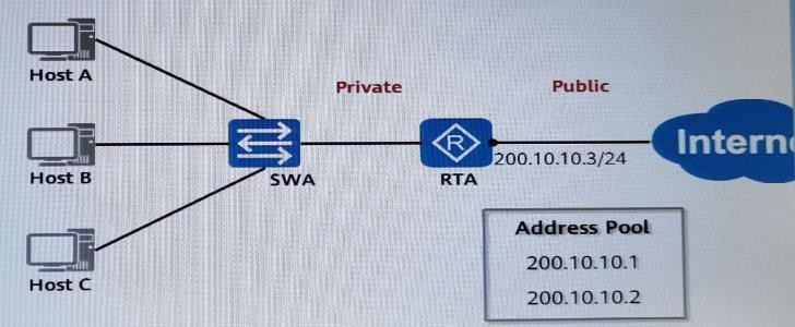 146.如图所示,RTA 使用 NAT 技术,且通过定义地址池来实现多对多的 NAPT 地址转换,使得私网内主机能够访问公网。假设地址池中仅有两个公网 IP 地址,并且已经分配给主机 A 与 B 做了地址转换,而此时若主机 C 也希望访问公网,则下列描述正确的是()。(单选)