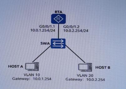 36.如图所示,主机 A 与主机 B 希望通过单臂路由实现 VLAN 间通信,则在 RTA 的 G0/0/1.1接口下该做哪项配置?(单选)