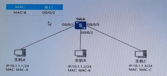 40.如下图所示,假设SWA的MAC地址表如下,现在主机A发送一个目的MAC地址为MAC-B的数据帧,下列说法正确的是?(单选)