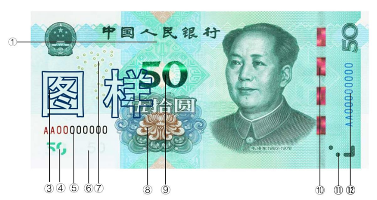 49、移动倾斜观察2015年版人民币100元的光彩光变数字,可见数字颜色在金色和绿色之间交替变化,并可见到一条亮光带左右滚动。