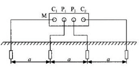 89.采用如下图的文纳四级法测量土壤电阻率时,当电极间距离为2m时,土壤电阻为3.0Ω时,土壤电阻率ρ值为()。