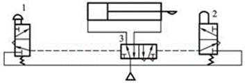210.在下图所示的行程控制单往复动作回路中,当挡块压下行程阀2时,()复位,活塞自动返回。