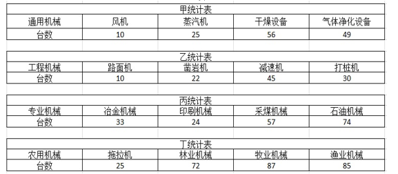 某特大型机械制造企业在年终总结会前,由甲、乙、丙、丁四家分公司对各自企业本年度生产的机械设备进行了分类统计并制定如下统计表。根据机械使用用途分类方法,上述四家分公司制造的统计表中,正确的是( )。