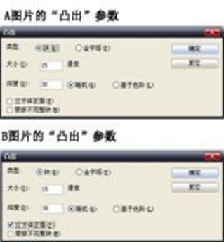 当“马赛克”和“凸出”的像素大小参数值相同时,A图片进行了“滤镜”>“像素化”>“马赛克”再“滤镜”>“风格化”>“凸出”处理,B图片进行了“滤镜”>“风格化”>“凸出”处理,请问,A、B图的效果是否相同?(请注意下图中“凸出”对话框中的)