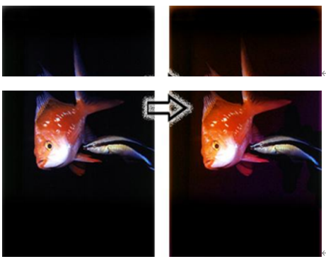 左图为原图,右图为处理后的效果,那是图层混合模式的哪一效果,使鱼儿恢复了其本