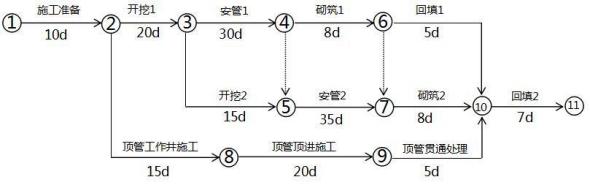 图 1-1:网络进度计划图施工过程中发生以下事件:事件一:第一段管道沟槽开挖( )施工时,施工单位为了赶工期,采用机械开挖沟槽,建设单位组织 验槽时发现,局部地区地基遭到扰动和超挖,超挖深度最大为 200mm,下部坚硬,无地下水。施工单位依据 设计文件进行基底处理,为此损失工期 3d。事件二:第二段管道沟槽开挖( )施工时,由于不可抗力,影响工期 16d。事件三:建设单位变更设计,未及时向施工单位提供顶管施工图纸,使顶管工作井施工比实际开始时间晚 了 50d。【问题】