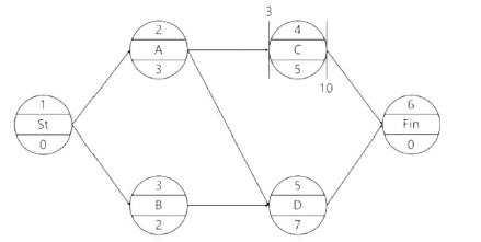 58.单代号网络计划中,工作 C 的已知时间参数(单位:天)标注如下图所示,则该工作的最迟开始时间, 最早完成时间和总时差分别是( )天。