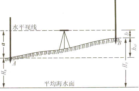 如图,测量A、B 两点间的高差h,在A、B上竖立水准尺,用水准仪构成一条水平视线,该视线在两尺上取得读数a和b。则A与B的高程之差:hAB = a–b(高差h有正有负)如已知A点高程为HA ,则B点的高程:HB=HA+hAB
