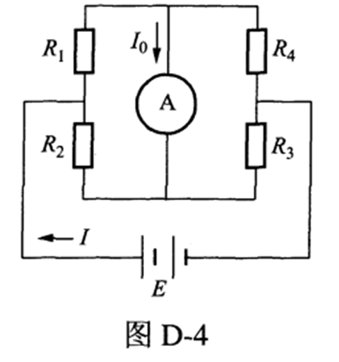 1.>如图D-4所示,已知E=12V,R1=R2=lΩ,R3=R4=4Ω=4Ω,试求电流表电流I0以及电源支路的电流I分别是多少?