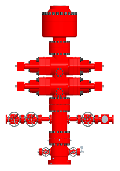 14. [JXJK183-02-Y] 如图所示,如果井控装置从上至下依次为:环形、全封、半封、钻井四通、套管头,在井内有钻具的情况下,发生溢流关井后可以更换钻井四通两侧闸门。