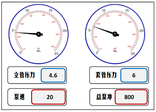 64. [JXJK043-01-Y] 发生溢流关井后,求取的立压与套压如图所示,之前测得的压井泵速25冲/min时的循环立压为3MPa,则进行工程师法压井作业时的初始循环总压力为( )MPa。