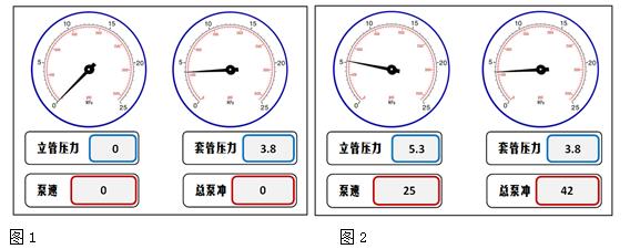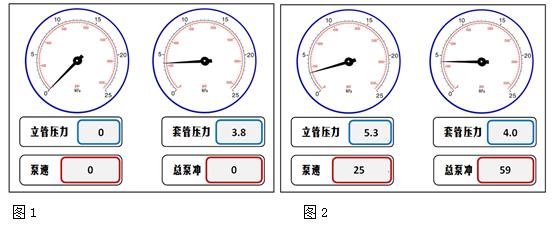 60. [JXJK043-01-Y] 钻柱中安装钻具回压阀,关井后压力如图1所示,已知在泵速25冲/min时的循环压力为2.8MPa,采用循环法求取关井油管压力状态如图2所示,现在的压力稳定则关井油管压力为( )MPa。