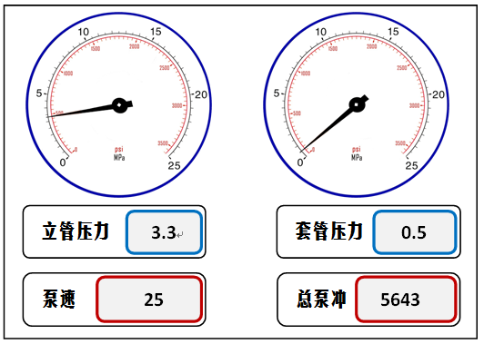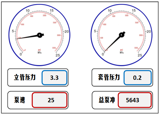 58. [JXJK043-01-Y] 已知测得的压井泵速25冲/min时的循环立压为3MPa,钻进时发生溢流关井后求取的立压为3MPa,套压为5MPa,已知终了循环总压力为3.3MPa,钻具内容积为1543冲。现进行司钻法压井第二循环周操作,状态如图所示,此时应该( )。