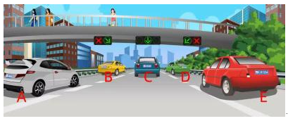 在图中所示有车道信号灯的路段,请判断哪辆机动车行驶的车道是正确的?