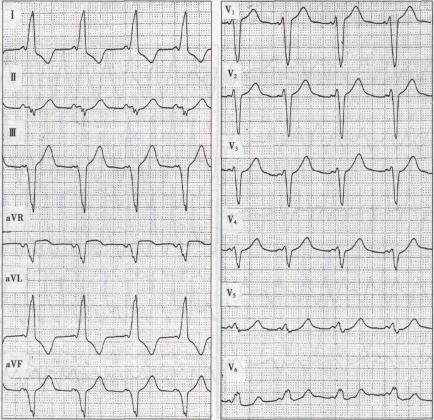 195. 患者男性,39 岁,反复发作心慌数年,心慌时心电图记录如图所示,心电图显示宽 QRS 波群的 RR 间 距比窄QRS 波群的 RR 间距长40ms,该心电图应诊断为