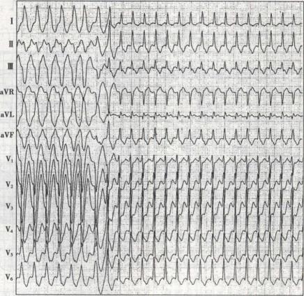 195. 患者男性,39 岁,反复发作心慌数年,心慌时心电图记录如图所示,心电图显示宽 QRS 波群的 RR 间 距比窄QRS 波群的 RR 间距长40ms,该心电图应诊断为