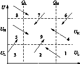 49. 如图F-10所示电路简述电压无功控制装置在第2、3、5、6区域的调节原理。图F-10