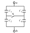 27. 如图D-16所示电路,4个电容器的电容各为C1=C4=0.2F,C2=C3=0.6F。试求:(1)开关S打开时,ab两点间的等效电容。(2)开关S合上时,ab两点间的等效电容。