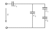 10. 图D-7所示电路中,已知C1=1F,C2=3F,C3=6F,C4=2F,各电容器原不带电,求加上电压U=100V后各电容器上的电压。