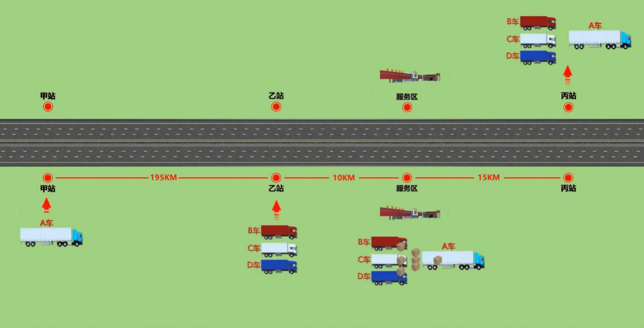 6、超载货车A从甲站进入高速,B、C、D三辆空车均从乙站进入高速,四车均行驶到同一服务区,超载货车A将超载货物分转给B、C、D车,四辆车继续行驶,最后均从丙站出高速。以下说法正确的是:()( )