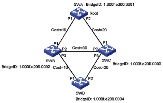 9. 在如图所示的交换网络中,所有交换机都启用了STP 协议。SWA 被选为了根桥。根据图中的信息来看,( )端口应该被置为Blocking 状态。(选择一项或多项)