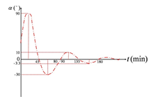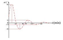 0046.如图所示,一陀螺罗经主轴在方位上(α)随时间( )阻尼摆动的曲线,若该罗经主轴的初始方位位于偏东180°,不考虑其他因素,则该罗经自启动到指向精度满足航海要求(±1°),至少需要的稳定时间为______。
