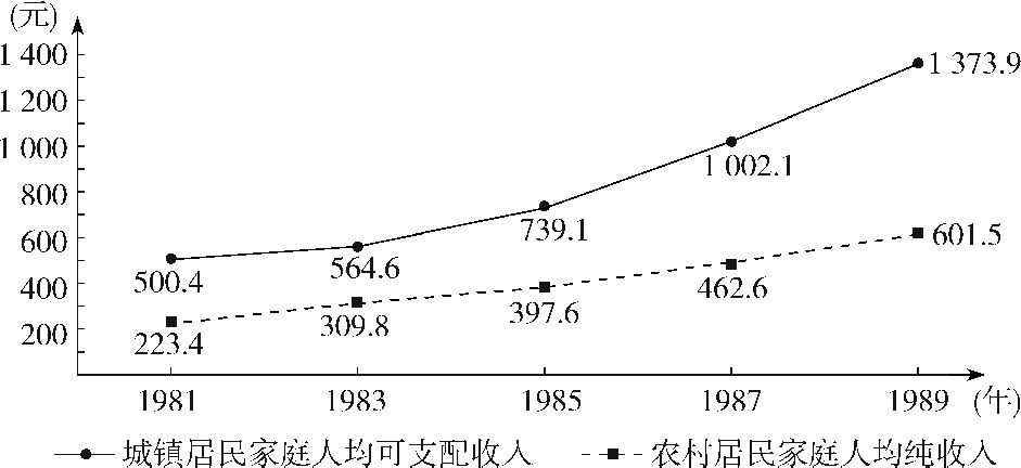 88.下图是我国某地城乡居民人均收入图,图中的城乡差距最小年份出现的原因是( )