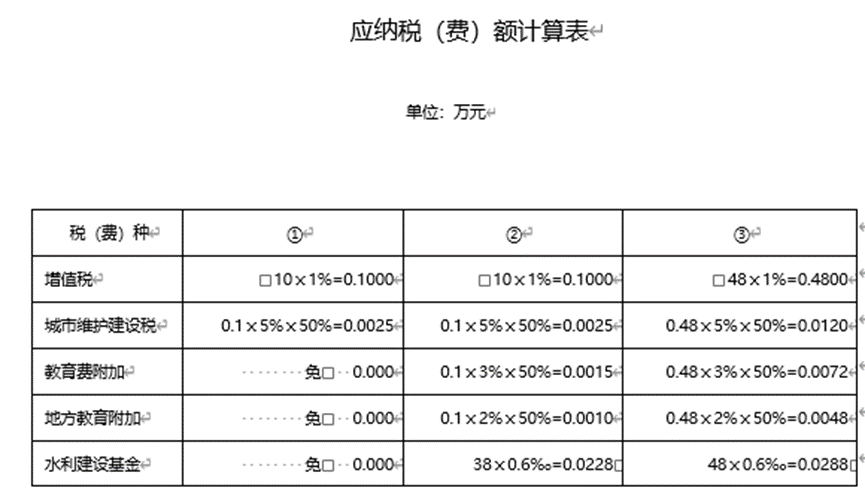 正确答案:答:1、情况①应纳税(费)额(单位:万元)增值税10ⅹ1%=0.1000城市维护建设税0.1ⅹ5%ⅹ50%=0.0025教育费附加、地方教育附加、水利建设基金均0(免);2、情况①应纳税(费)额(单位:万元)增值税10ⅹ1%=0.1000城市维护建设税0.1ⅹ5%ⅹ50%=0.0025教育费附加0.1ⅹ3%ⅹ50%=0.0015、地方教育附加0.1ⅹ2%ⅹ50%=0.0010、水利建设基金38ⅹ0.6‰=0.0228;3、情况①应纳税(费)额(单位:万元)增值税48ⅹ1%=0.4800城市维护建设税0.48ⅹ5%ⅹ50%=0.0120教育费附加0.48ⅹ3%ⅹ50%=0.0072、地方教育附加0.48ⅹ2%ⅹ50%=0.0048、水利建设基金48ⅹ0.6‰=0.0288