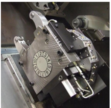 12234.下图所示装置为数控中心架,其开、合由(液压系统)提供动力,加工细长轴时,若使用不当容易产生( )。