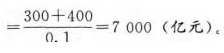 解析:根据收入恒等于支出的原理:均衡国民收入=消费+投资+政府购买+净出口,将消费函数代入收入恒等式.均衡国民收入=(自发消费+边际消费倾向×均衡国民收入)+投资+政府购买+净出口。本题中,仅涉及两部门,故没有政府购买和净出口。均衡国民收入=300+(1-0.1)×均衡国民收入+400,均衡国民收入