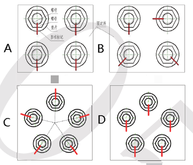 76.根据相关质量要求,同一产品的相同位置防松标识应一致,其中圆形布置的螺栓标识线呈辐射状朝外,以下图片中防松标识正确的是( )