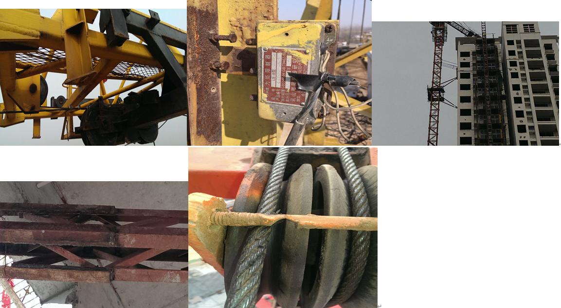 30、××市某房建工程在行业主管部门检查中发现现场多台塔吊存在较多安全隐患(包含重大事故隐患)如图片所示,被下发暂停使用通知书,项目部整改不及时且擅自使用致2日后一台塔吊发生折臂事故,所幸无人员伤亡。经查该台塔吊最近一次检测日期为1年零3个月,最近一次维修保养为2个月前,现场司机持特种证,司索工未持证。4、该项目多台塔吊的5张照片安全隐患分析正确的有( )。