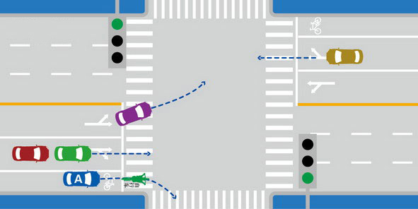 935.如图所示,A车在这样的路口可以借用非机动车道右转弯。