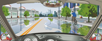 845.驾驶机动车遇到骑自行车人占道影响通行时,可连续鸣喇叭加速从其左侧绕行。