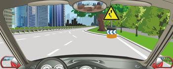 719.图中标志提醒障碍物在路中,车辆从右侧绕行。