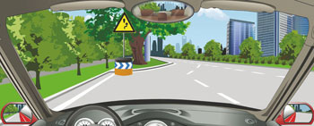 720.图中标志提醒障碍物在路中,车辆从左侧绕行。
