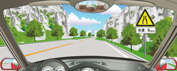 686、右侧标志警告前方路面两侧变窄长度为5公里。