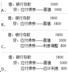 1720.某企业2018年3月1日发行票面利率为8%的5年期一次还本付息债券,债券面值为5000万元,发行价格为5800万元,不考虑其他因素,债券发行日企业正确的会计处理是(单位为万元)()。rn