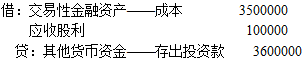 解析:企业取得交易性金融资产时,应当按照该金融资产取得时的公允价值作为其初始入账金额,所支付价款中包含的已宣告但尚未发放的现金股利或已到付息期但尚未领取的债券利息,应当单独确认为应收项目,所发生的相关交易费用应当在发生时计入当期损益,冲减投资收益。因此,该项交易性金融资产的入账成本=3600000-100000=3500000(元)。购入时相关会计分录如下:rn①购入股票rn