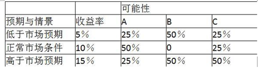 932.商业银行计划推出A、B、C三种不同金融产品。预期在不同市场条件下,三种产品可能产生的收益率分别为5%、10%、15%,产生不同收益率的可能性如表1—2所示。 表1—2A、B、C产生不同收益率的可能性