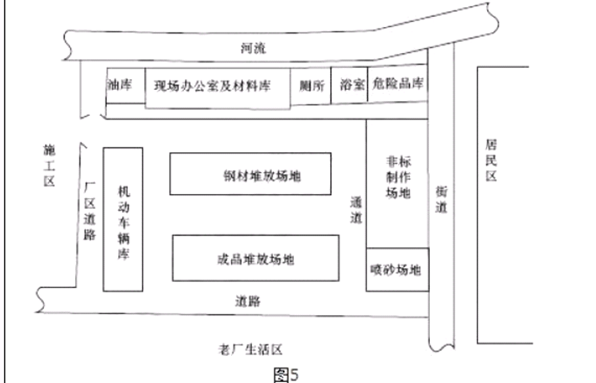 411.A公司总承包某地一扩建项目的机电安装工程,材料和设备由建设单位提供。A公司除自己承担主工艺线设备安装外,非标准件制作安装工程、防腐工程等均匀分包给具有相应施工资质的分包商施工。考虑到该地区风多雨少的气候,建设单位将紧靠河边及施工现场的一所弃用学校提供给A公司项目部,项目部安排两层教学楼的一层做材料工具仓库,二楼作现场办公室,楼旁临河边修建简易厕所和浴室,污水直接排入河中,并对其他空地做了施工平面布置。(见图5)